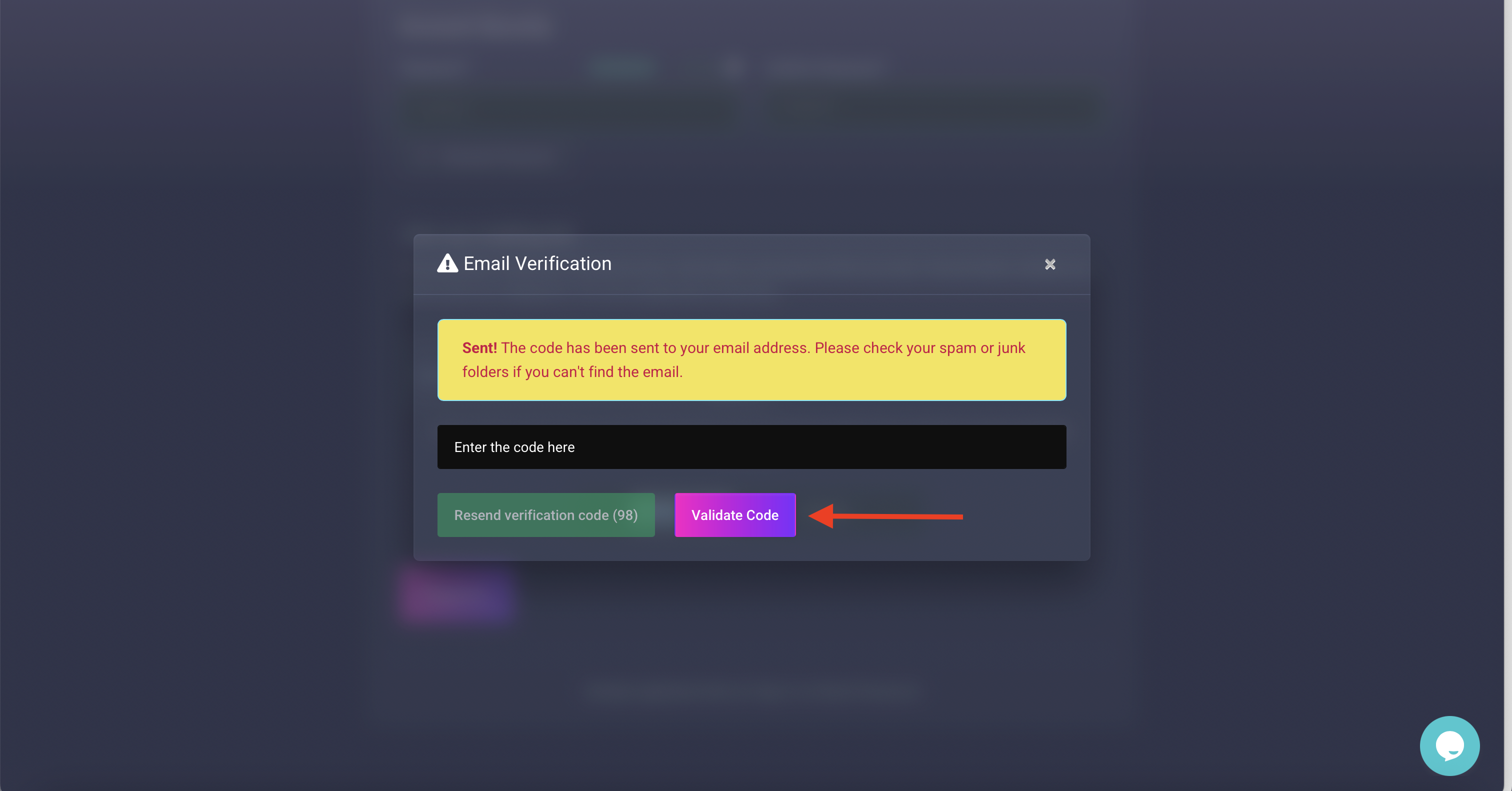 3. Check your email inbox for your account verification code, if you don't see the link in your inbox check your spam folder. Enter the code then select "Validate Code"